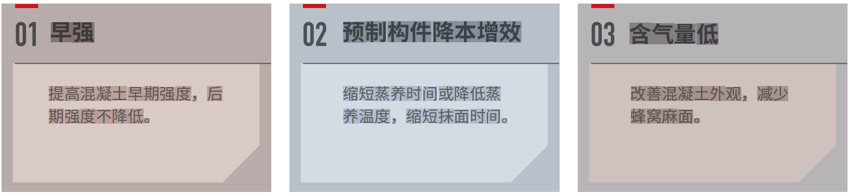 預(yù)制混凝土、低溫施工混凝土、其他對(duì)早期強(qiáng)度 有要求的混凝土。 鐵路、公路、機(jī)場(chǎng)、橋梁、水電、市政、民用建 筑等領(lǐng)域。