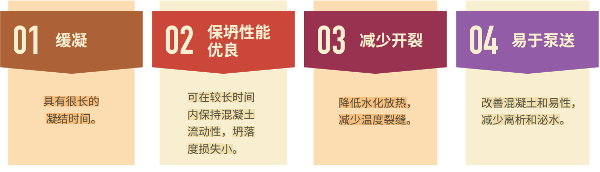 該系列產(chǎn)品具有超長緩凝和保坍功能,改善混凝土工作性,對混凝土后期強度無不利影響。